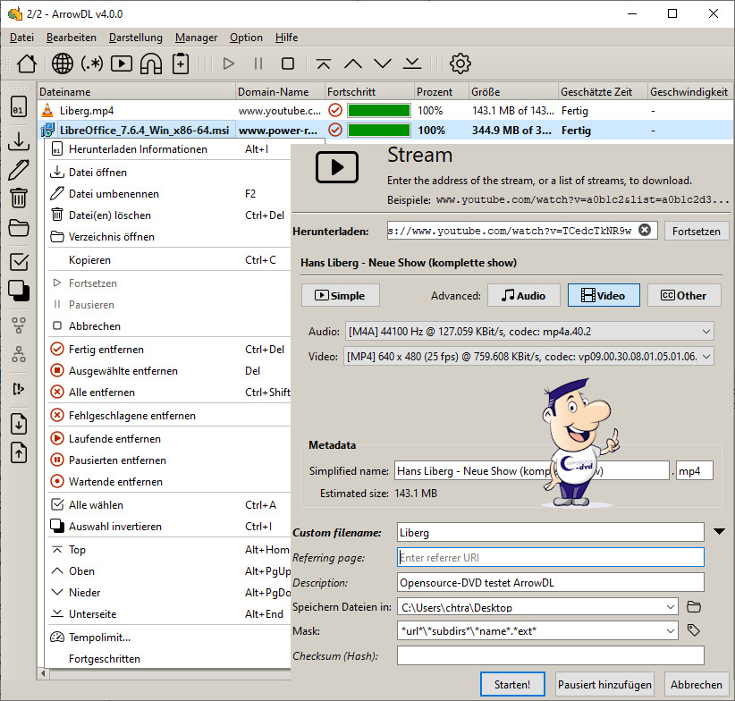 ArrowDL ist ein Alleskönner im Download-Bereich. Er beherrscht die Wiederaufnahme und das Planen eines Downloads, das Herunterladen von Torrents, das Kopieren des Inhalts einer Webseite auf Ihren PC, Bandbreitenbeschränkung und das simultane Downloaden mehrerer Dateien. Downloads sind über HTTP, HTTPS, FTP und diverse Videostream-Protokolle möglich. Zum Herunterladen von Clips, die auf Videoportalen wie Youtube oder Dailymotion angeboten werden, klicken Sie auf den Play-Button (Audio/Video Stream herunterladen). Die kopierte Internetadresse des Videos wird automatisch eingefügt und erkannt. Jetzt lassen sich weitere Einstellungen wie das Videoformat anpassen, bevor Sie auf "Starten!" klicken.