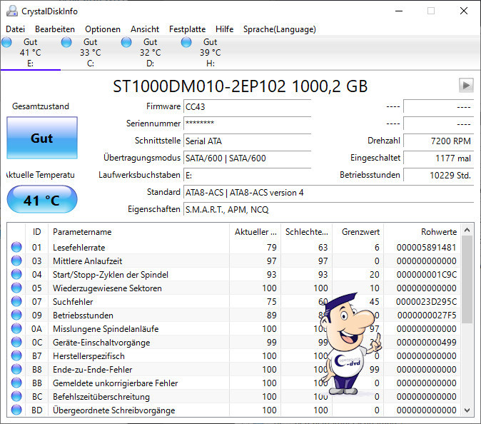 S.M.A.R.T. ist auf vielen Festplatten zu finden und überwacht sie permanent, um mögliche Defekte rechtzeitig zu erkennen. CrystalDiskInfo wertet die Daten der S.M.A.R.T.-Protokolle aus und stellt sie in übersichtlicher Form dar. Neben statischen Werten wie Firmwareversion, Seriennummer, Schnittstelle und Übertragungsmodus erfahren Sie die aktuelle Anzahl der Einschaltzyklen und die der Arbeitsstunden sowie die Temperatur.