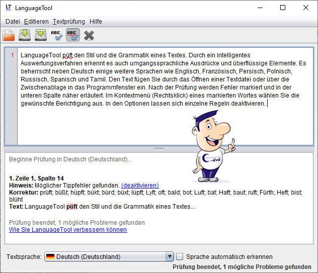 LanguageTool prüft den Stil und die Grammatik eines Textes. Durch ein intelligentes Auswertungsverfahren erkennt es auch umgangssprachliche Ausdrücke und überflüssige Elemente. Es beherrscht neben Deutsch einige weitere Sprachen wie Englisch, Französisch, Persisch, Polnisch, Russisch, Spanisch und Tamil. Den Text fügen Sie durch das Öffnen einer Textdatei oder über die Zwischenablage in das Programmfenster ein. Nach der Prüfung werden Fehler markiert und in der unteren Spalte näher erläutert. Im Kontextmenü (Rechtsklick) eines markierten Wortes wählen Sie die gewünschte Berichtigung aus. In den Optionen lassen sich einzelne Regeln deaktivieren.