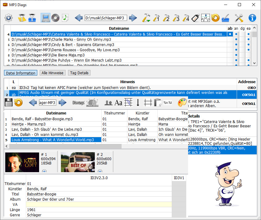 MP3 Diags repariert nicht nur Fehler in MP3s, sondern ist auch Tool zum Editieren von ID3v3-Tags sowie zum Umbenennen der Dateien. Wählen Sie zunächst die Ordner mit MP3-Dateien aus, die das Programm analysieren und bei Bedarf reparieren soll. Markieren Sie zur Sicherheit "Backup für veränderte Dateien erstellen". Bei einer größeren Anzahl an MP3-Dateien empfiehlt es sich, die Anzeige der Tracks nach Ordner oder nach Dateimerkmalen wie MPEG-Dateien mit niedriger Qualität, fehlerhafte MPEG-Streams und MPEGs ohne ID3V2-Tags zu filtern.