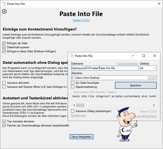 Die Stapelverarbeitung speichert automatisch jede neue Kopie in der Zwischenablage jeweils in einer Datei. Sobald Sie in den Einstellungen "Tray Autostart" aktivieren, setzt sich Paste Into File nach dem nächsten Systemstart in den Infobereich der Taskleiste. Das Zwischenablage-Patching erlaubt es, den Inhalt der Zwischenablage mit dem normalen Einfügehotkey STRG/V als Datei abzuspeichern. Das Tool unterstützt zahlreiche Dateiformate wie CSV, GIF, HTML, JPG, PDF, PNG, RTF, SVG, TXT und ZIP.