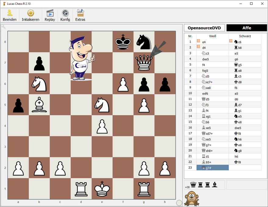 Weitere Übungen finden Sie im Trainingsmenü. Dazu zählen u.a. Mattstellungen, "Finde den besten Zug", Eröffnungen lernen und Blindschach. Während des Spieles kann nach einem Ihrer Züge ein Fenster erscheinen, das Ihnen einen alternativen Zug (Tutor) vorschlägt. Dabei können Sie überlegen, warum die Engine diesen Zug favorisiert. Auf diese Weise wird Ihr Lernfortschritt gefördert. Ein Spielstand lässt sich zu jeder Zeit abspeichern und später wieder aufrufen. Auch anderen Personen steht das Trainingsprogramm unter einem eigenen Benutzernamen (Einstellungen - Benutzer) offen. Über das Spielen-Menü können Sie inzwischen auch gegen sich selbst oder eine andere Person (Play human vs human) spielen. Für fortgeschrittene Schachspieler eignet sich besonders